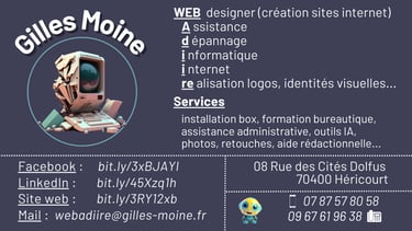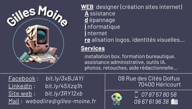 Micro-entreprise de création de sites internet, d'identité visuelle, d'aide et assistance courriers et démarches en ligne et d'assistance et dépannage informatique localisée à Héricourt 70400 au cœur de l'Aire Urbaine. Interventions majoritairement réalisées chez le client soit pour les dépannages, soit pour des échanges permettant de réaliser un cahier des charges permettant la réalisation par exemple d'un site internet ou d'une boutique en ligne.