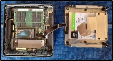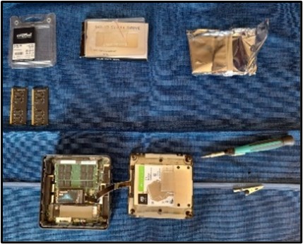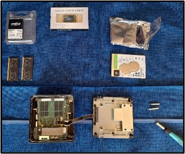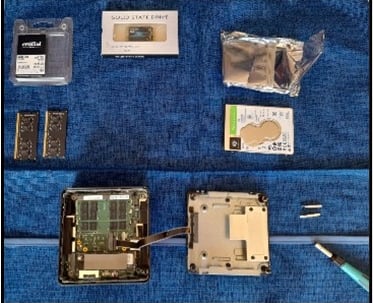 Ensuite, ouvrez délicatement le boîtier de votre Geekom IT13. Commencez par retirer la mémoire RAM existante et installez la nouvelle mémoire de 64 Go, en vous assurant que les clips se mettent bien en place. Puis, ajoutez le disque dur SSD de 1 To. Pour ce faire, le positionner sur le slot M2 2242 SATA disponible, le brancher en s’assurant qu’il est bien connecté sur le slot puis le fixer à l’aide d’une vis sur le point de fixation. Enfin, installez le HDD de 2 To en retirant les quatre vis de fixation de la plaque de maintien et en positionnant et connectant le disque sur le slot SATA 2,5'' disponible.