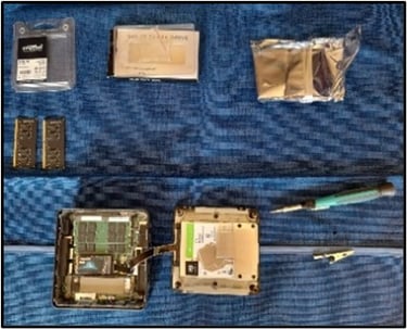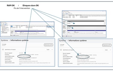 Exemple de prestation d'échange et ajout de composants. Passage de la RAM de 32 à 64Go, ajout d’un disque dur SSD de 1To et ajout d’un disque dur HDD de 2To. RAM = Mémoire Random Access Memory - SSD = Solid State Drive (nouvelle génération de disques durs électroniques sans mécanique plus rapides et plus fiables) - HDD = Hard Disk Drive (ancienne génération de disques durs mécaniques)